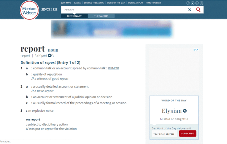 Let's look up the noun "report" into a dictionary. I'll look this up in the Merriam-Webster dictionary, though any other dictionary would work. When looking up "report", we're getting the following definitions: