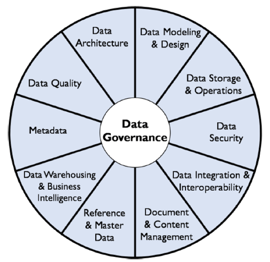 The overall data management function is made out of these 11 components, or knowledge areas as identified by the Data Management Association International (in no particular order):